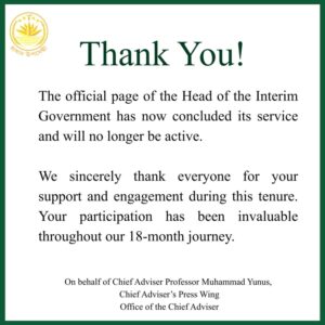 ছবি সম্বলিত পোস্টে উল্লেখ করা হয়, ধন্যবাদ! অন্তর্বর্তীকালীন সরকারের প্রধান উপদেষ্টার অফিশিয়াল পেজটি এখন আর সক্রিয় থাকবে না। আপনাদের সমর্থন এবং স্বতঃস্ফূর্ত অংশগ্রহণের জন্য আন্তরিকভাবে ধন্যবাদ জানাচ্ছি। আমাদের ১৮ মাসের এই যাত্রায় আপনাদের অংশগ্রহণ ছিল অমূল্য।